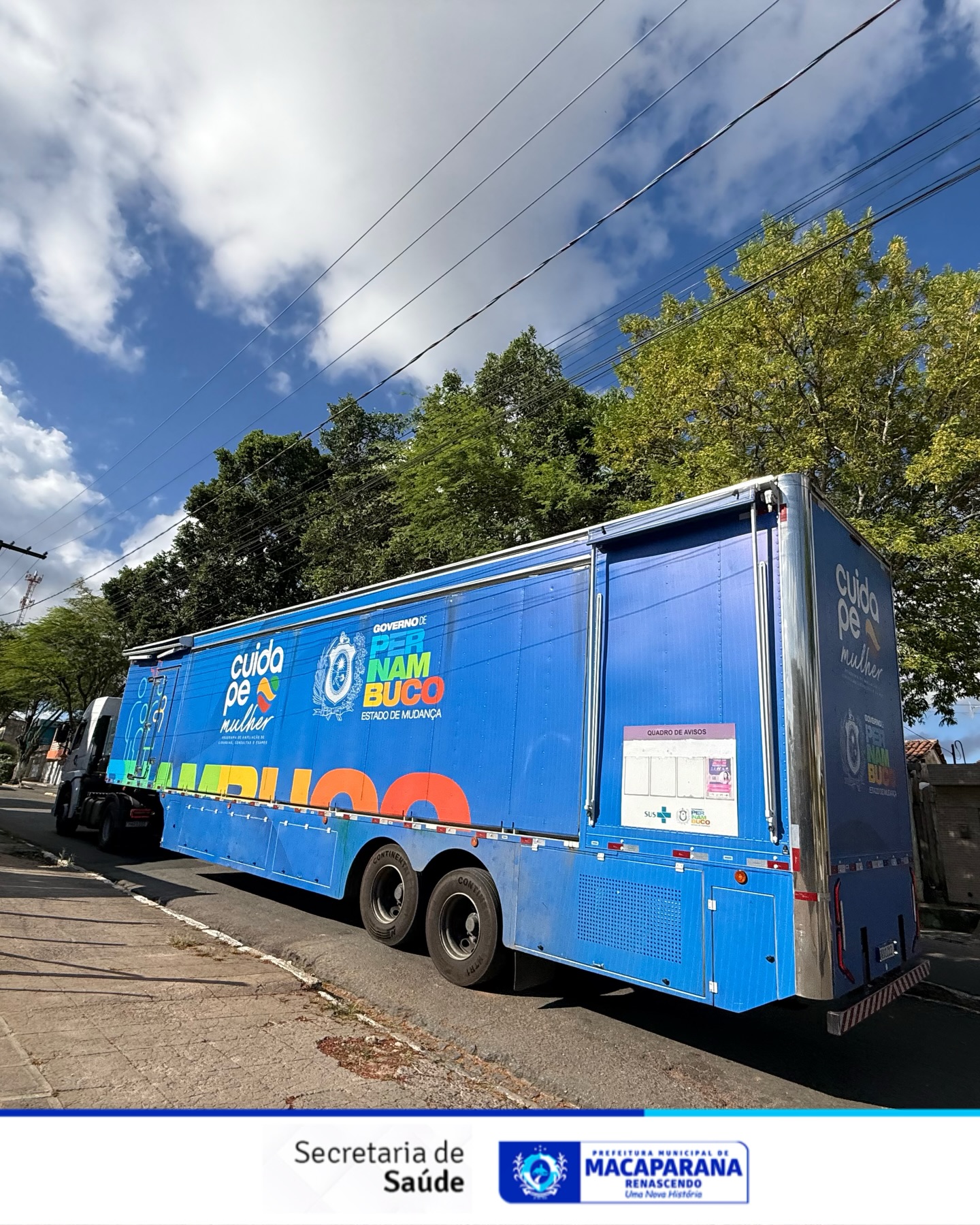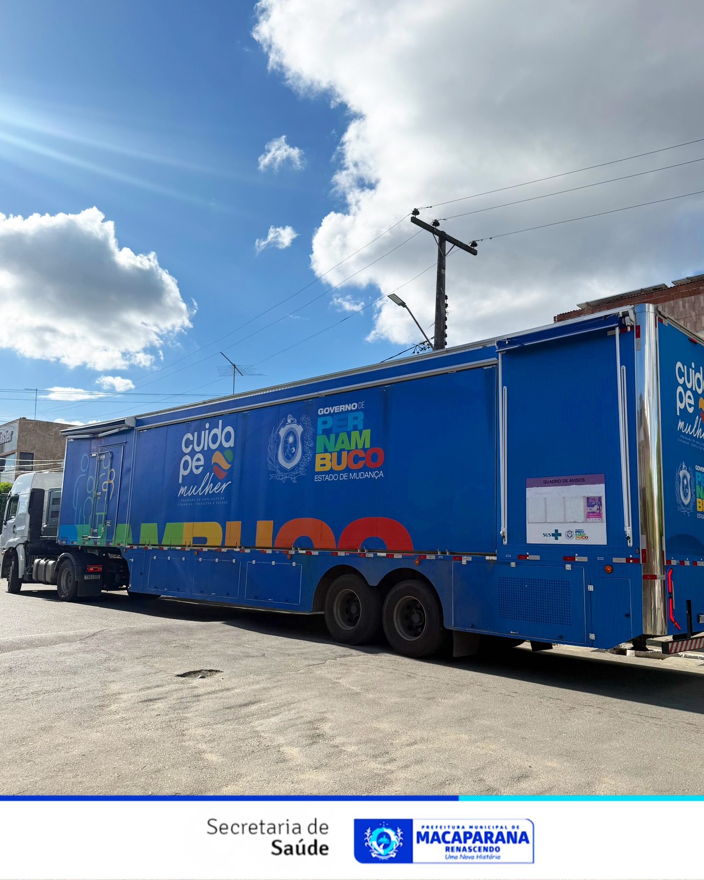 A Carreta da Mulher chegou neste sábado ao município de Macaparana e está sendo totalmente instalada em frente ao Macaparana Clube. A ação contará com três dias de atendimento, iniciando nesta segunda-feira e seguindo até a quarta-feira, oferecendo exames, atendimentos preventivos e orientações essenciais para o diagnóstico precoce e preciso da saúde da mulher.